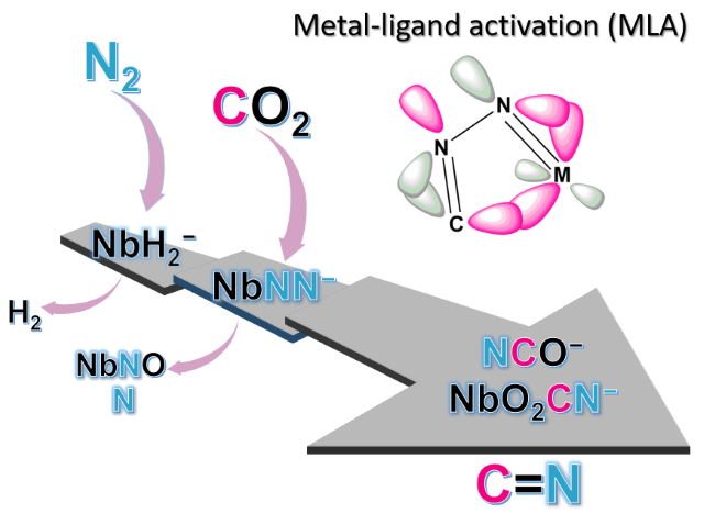 在国家自然科学基金委重大研究计划的支持下,我校化学与化工学院马嘉璧副教授团队在前期的研究基础上,实现了室温下依次活化N2和CO2制备C−N键。深入的理论计算表明:在温和条件下通过CO2和N2之间的耦合来构建C−N键的最有利步骤如下:1)N2预活化、2)CO2活化、3)C−N键的形成同时N−N键断裂。在N2活化过程中,C的2p轨道与N的2p轨道相互作用,而不是与过渡金属d轨道相互作用,只有一个非贵金属Nb原子是激活N2所必需的,来自CO2的相邻C原子则是一个电子库,用来接受和提供电子。这是首例实现了N2和CO2室温下活化耦合的气相团簇,这项工作揭示了一种新的重要的N2活化模式——金属—配体活化(Metal-Ligand Activation,MLA),该反应模型将有助于开发设计单金属原子催化剂的新策略。
