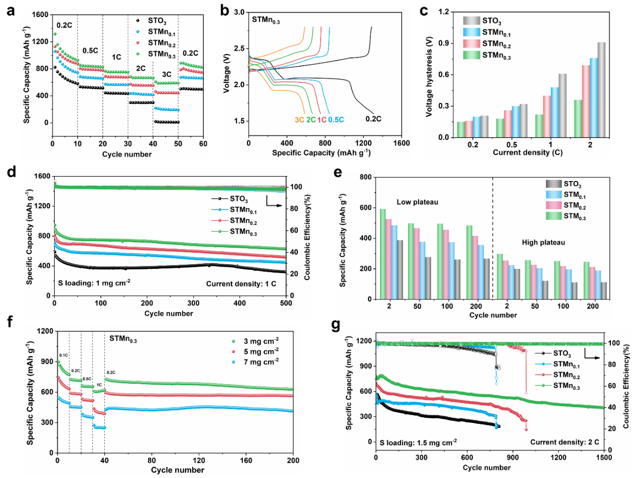 在国家自然科学基金委的支持下,我校化学与化工学院王振华教授和孙克宁教授团队在前期的研究基础上,基于缺陷化学理论,选择具有吸附性能和电化学稳定性的钛酸锶基钙钛矿氧化物作为基底材料,对钛酸锶基钙钛矿氧化物Sr0.9Ti1-xMnxO3-δ (STMnx) (x="0.1-0.3)进行了氧空位浓度的调控,改善其吸附-催化性能,实现了高性能锂硫电池。以具有较高氧空位浓度的STMn0.3作为正极载体的锂硫电池,在2C下进行1500次循环后仍可提供780 mAh g-1的高初始比容量和0.032%的低衰减率。这种氧空位的定量调控策略对缺陷材料的设计与调控具有启发意义,可在锂硫电池及相关储能与转换系统领域推广应用。