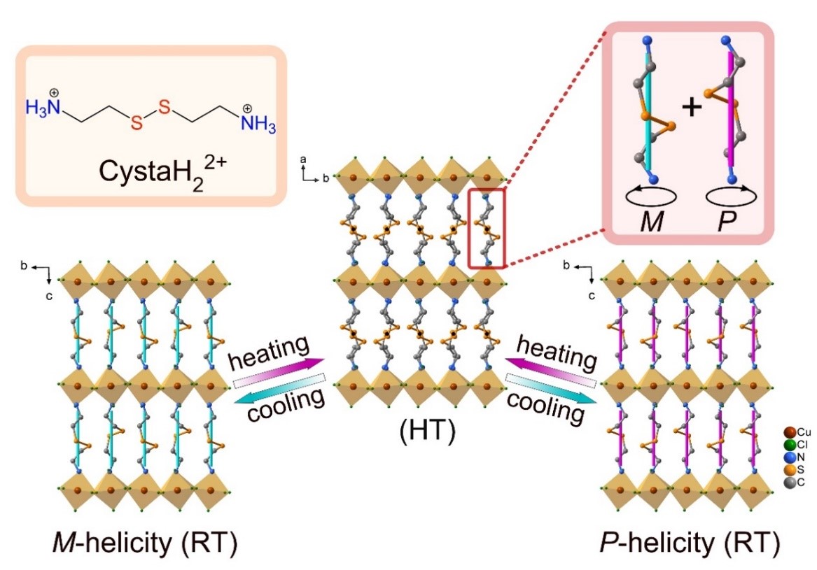 该研究团队在前期通过分子结构变化调控材料力、电、磁物理性质的基础上,( Nat. Commun. 2019, 10 , 4805; CCS Chem. 2021, 2, 2464–2472; Nat. Commun. 2021, 12 , 6908; Nat. Commun. 2021, 13 , 3510),利用胱胺有机阳离子具有显著结构柔性且在结晶过程易于形成螺旋手性构型的特点,合成胱胺四氯合铜(II)二维钙钛矿型晶体。利用胱胺阳离子中间‒C‒S‒S‒C‒结构片段螺旋取向与分子电偶极矩的结构关联,通过电场控制该结构片段取向变化,首次实现了电场控制晶态分子的 P -M螺旋手性以及铁电自发极化的协同反转。铁电性质与手性调控的耦合,不仅为外部刺激控制材料手性提供了研究思路,同时有望应用于开发新型手性电子器件。