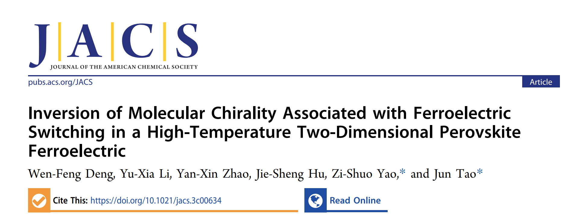 近日,北京理工大学化学与化工学院姚子硕研究员在刺激响应分子基单晶材料研究中取得重要进展。相关工作以“Inversion of Molecular Chirality Associated with Ferroelectric Switching in a High-Temperature Two-Dimensional Perovskite Ferroelectric”为题,发表在国际著名化学期刊《美国化学会志》。北京理工大学为唯一作者单位,化学与化工学院陶军教授和姚子硕研究员为文章共同通讯作者,文章第一作者为北京理工大学硕士研究生邓文峰。