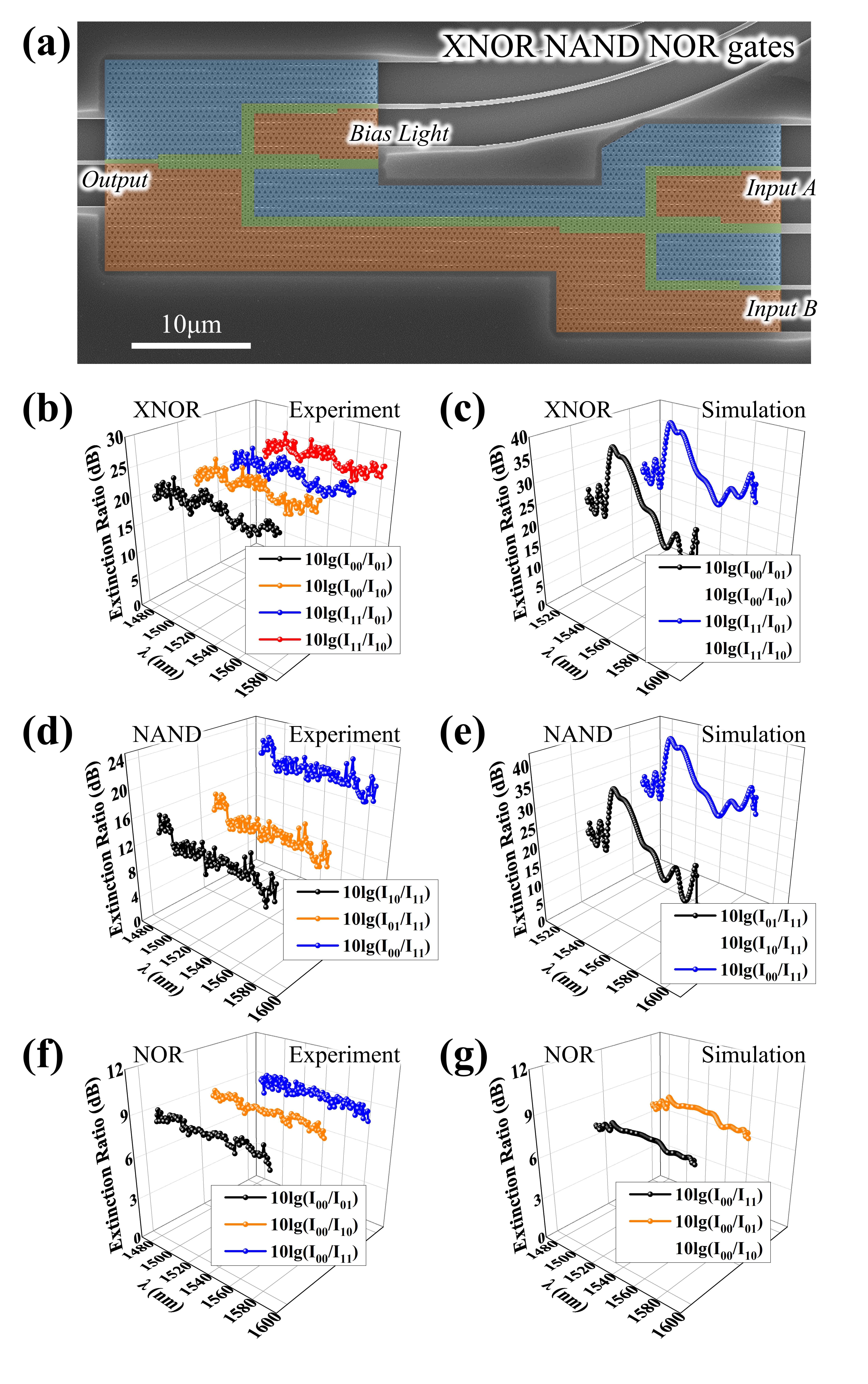 除了拓扑保护的XOR和OR门,研究人员进一步设计并制备了级联的XNOR、NAND和NOR门。该结构是由两个OR和XOR门级联构成的,如图3a所示。对于XNOR门,输入A和B之间的相位差被设置为Δ𝜑=𝜋。因此,干涉相长现象使得逻辑信号从右逻辑单元传播到左逻辑单元。同时偏置光始终开启,其场幅值是输入A的倍。当其中一个输入信号(输入A和输入B)开启时,输出端口发生干涉相消现象,输出信号为0。对于其他输入状态(输入信号都开启或关闭),输出幅度不为零,对应逻辑输出信号为1。消光比的实验和模拟结果分别如图3b和3c所示。实验结果表明,在1480-1580 nm的通信频段内,工作带宽约为100 nm (ER>20 dB),最大消光比达到25.72 dB。理论和实验结果均表明,XNOR门具有良好的效率。使用同样的方式,研究人员分别实现了NAND(偏置光的振幅是输入A(B)的2倍), NOR(偏置光的振幅为输入A(B)处振幅的0.75倍)门,实验结果与相应的仿真结果均有很好的一致性。
