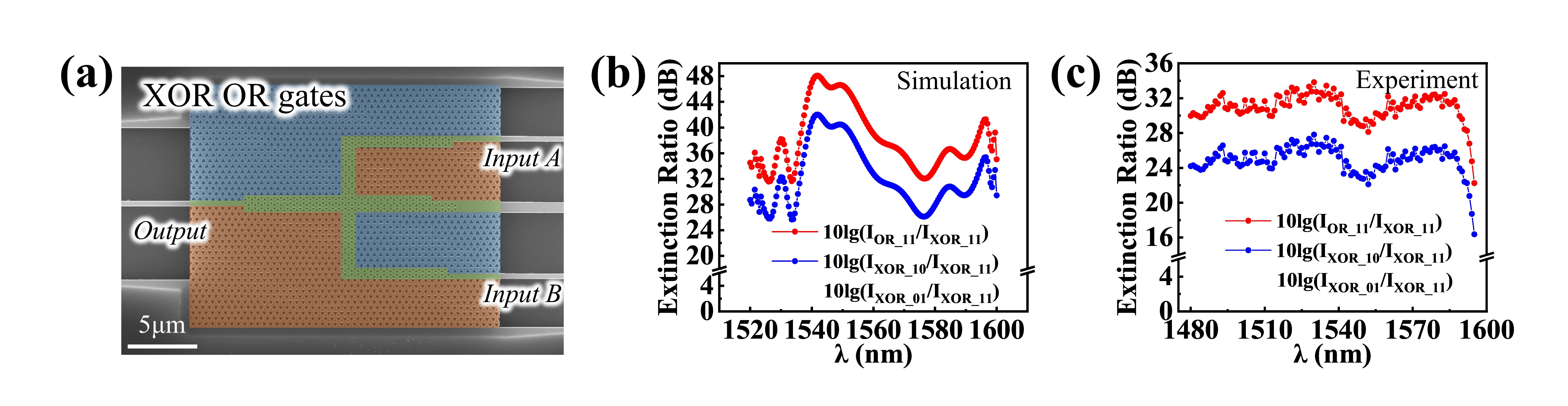 为了进一步实验证明所制备逻辑器件的鲁棒性,研究人员制备了具有三种缺陷的逻辑单元(XOR和OR门),如图5a的SEM图像所示。三个红色圆圈标记了三种不同类型的缺陷。实验结果(图5b)表明,这些器件在具有无序扰动的情况下依旧可以保持很高的消光比。
