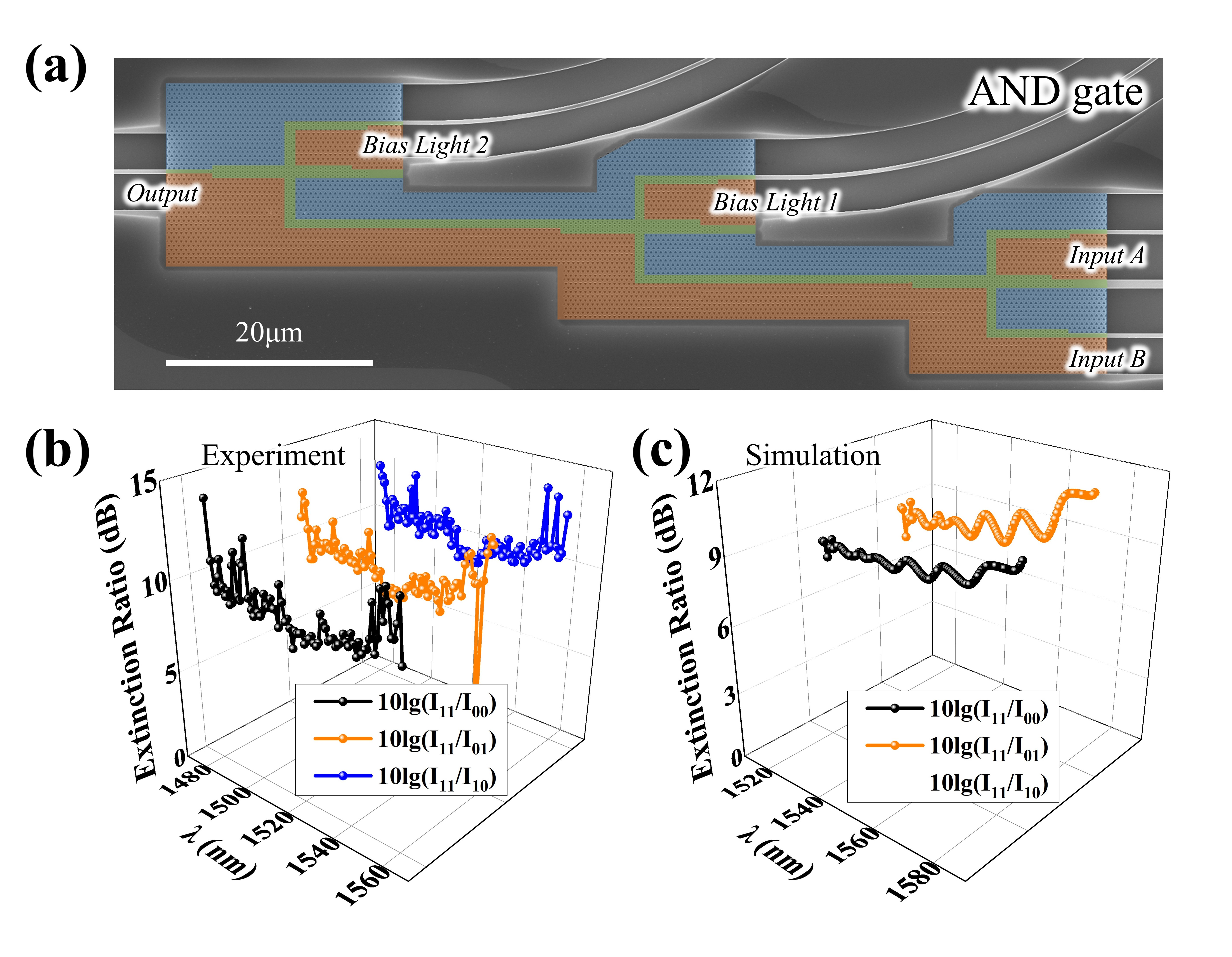 AND门可由NAND门和NOT门构成。如图4a所示。偏置光1和偏置光2的振幅分别设为输入A振幅的和0.75倍,仿真和实验结果如图4b和4c所示。