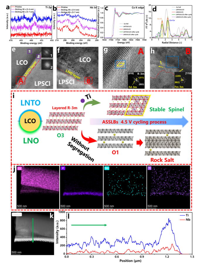 图1(a-b)循环后电池正极侧的Ti 2p,Nb 3d的XPS深度分析结果,(c-d)Co的XAFS K边吸收谱及相对应的R空间图,(e)LNTO@LCO循环后界面处的TEM图与FFT结果,(f)LNO@LCO循环后界面处的TEM图,(g)A处TEM放大图及对应区域的FFT结果,(h)B处TEM放大图及对应区域的FFT结果,(i)元素偏析的作用及在循环过程中LCO相变转化的示意图,(j)循环后正极的Co、P、Nb、Ti的EDS Mapping结果,(k-l)HAADF图像和相对应的元素线性分布图。