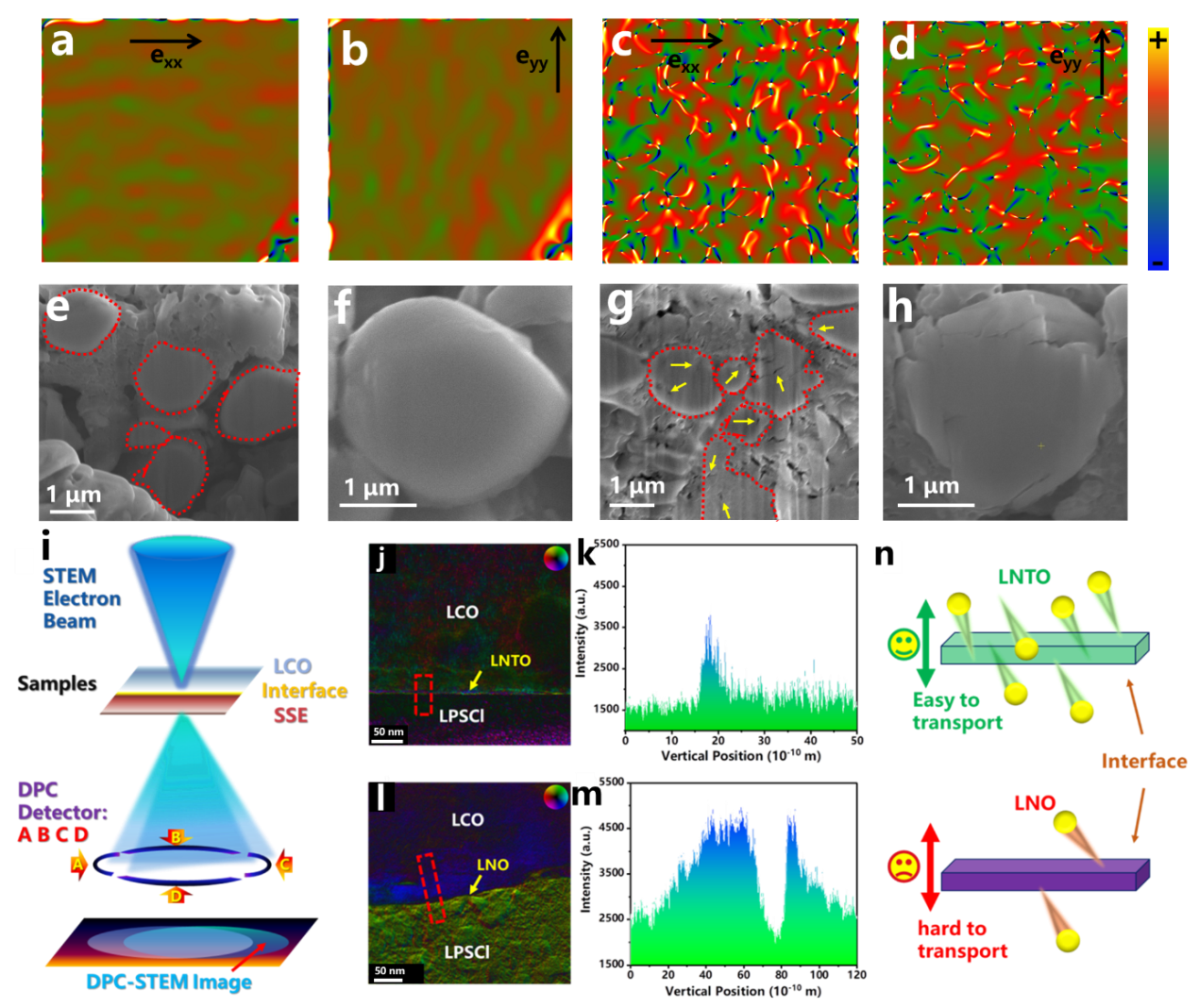 图2(a-b)LNTO@LCO正极循环后的x、y方向的GPA应力分布图,(c-d)LNO@LCO正极循环后的x、y方向的GPA应力分布图,(e-f)LNTO@LCO循环后颗粒的截面图及放大的颗粒图,(g-h)LNO@LCO循环后颗粒的截面图及放大的颗粒图,(i)DPC-STEM测试原理的示意图,(j-k)LNTO@LCO界面处的DPC图及电荷强度分布图,(l-m)LNO@LCO界面处的DPC图及电荷强度分布图,(n)界面处离子传输示意图。