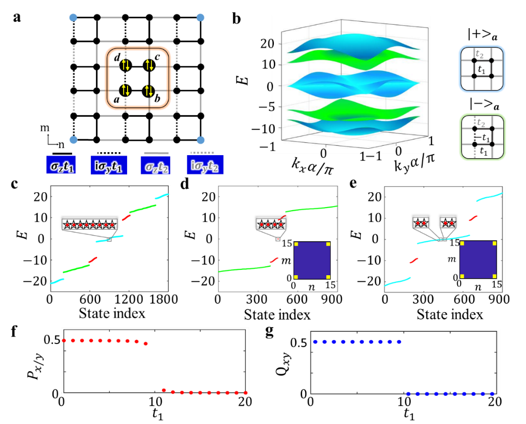 研究人员考虑具有U(2)非阿贝尔规范场的二维晶格模型,其中每个元胞包含四个子格点‘a’, ‘b’, ‘c’, ‘d’,且每个子格点具有一对内部赝自旋|↑>a,b,c,d和|↓>a,b,c,d,如图1a所示。元胞内和元胞间的耦合是通过具有不同耦合系数t1和t2的泡利矩阵σz,σy来实现。泡利矩阵[σz,σy]≠0的不对易性保证了非阿贝尔规范场的存在。图1b展示了非阿贝尔布洛赫能带的计算结果,五条能带由两个正交子空间构成。蓝色和绿色能带分别由一对耦合赝自旋|->d,|+>c,|->b,|+>a和|+>d,|->c,|+>b,|->a形成,其中|±>a,b,c,d="1/√2(|↑>a,b,c,d±|↓>a,b,c,d)是变换后的赝自旋基矢。右侧插图表示两种子空间单独对应的有效晶格模型,其分别可以映射到不同的高阶拓扑晶格模型上。需要强调的是非阿贝尔规范场破坏了系统的U(2)对称性,使得两个赝自旋在任何幺正变换下都无法分离,始终耦合在一起。这一特性是阿贝尔规范场所不具备的,即阿贝尔规范场所引起的内部赝自旋是可以通过幺正变换进行重组并分离的。因此,图1b的每个正交子空间都包含一对耦合的赝自旋,使非阿贝尔规范场诱导的高阶拓扑效应源于内部赝自旋的相互作用。为了探索非阿贝尔拓扑连续谱束缚态的存在,研究员计算了开边界条件下系统的本征能谱,如图1c所示。图1d和1e分别展示两种子空间的能谱,右下角插图呈现了零能局域态的空间分布。结果表明在这两个子空间中,都存在着高阶拓扑角态,同时高阶拓扑角态的本征能量嵌入到平庸体态中,形成非阿贝尔拓扑连续谱束缚态。为了进一步验证非阿贝尔拓扑连续谱束缚态的鲁棒性,研究人员引入两个子空间的耦合相互作用,使得非阿贝尔拓扑模型无法被分解为两个解耦的子空间。通过计算最低能带的Zak相位和第二,三能带的电四极矩可以发现,当包内耦合小于包间耦合时高阶能带拓扑仍然存在。这一现象进一步证明非阿贝尔连续谱束缚态是由两个不可分离的赝自旋相互耦合形成的。