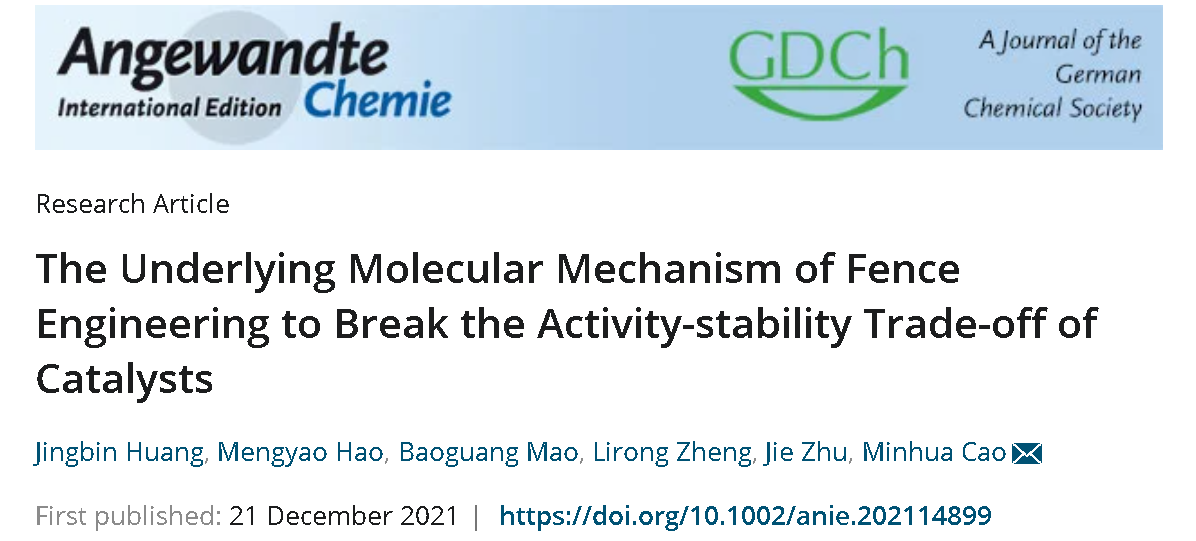 论文详情:Jingbin Huang,+ Mengyao Hao,+ Baoguang Mao,* Lirong Zheng, Jie Zhu, and Minhua Cao*. The Underlying Molecular Mechanism of Fence Engineering to Break the Activity-stability Trade-off of Catalysts, Angewandte Chemie International Edition, DOI: 10.1002/anie.202114899. 论文链接:https://doi.org/10.1002/anie.202114899
