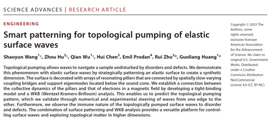 近日,北京理工大学大学宇航学院朱睿教授联合美国密苏里大学黄国良教授在弹性表面波拓扑输运研究方面取得新进展。相关成果以“Smart patterning for topological pumping of elastic surface waves”为题,在Science Advances上发表[Sci adv (2023) 9, eadh4310]。北京理工大学宇航学院朱睿教授和美国密苏里大学黄国良教授为论文的共同通讯作者。北京理工大学宇航学院博士研究生胡洲为论文的共同第一作者,完成了论文的样品制备和实验测试部分。该研究工作得到了国家自然科学基金委的资助。