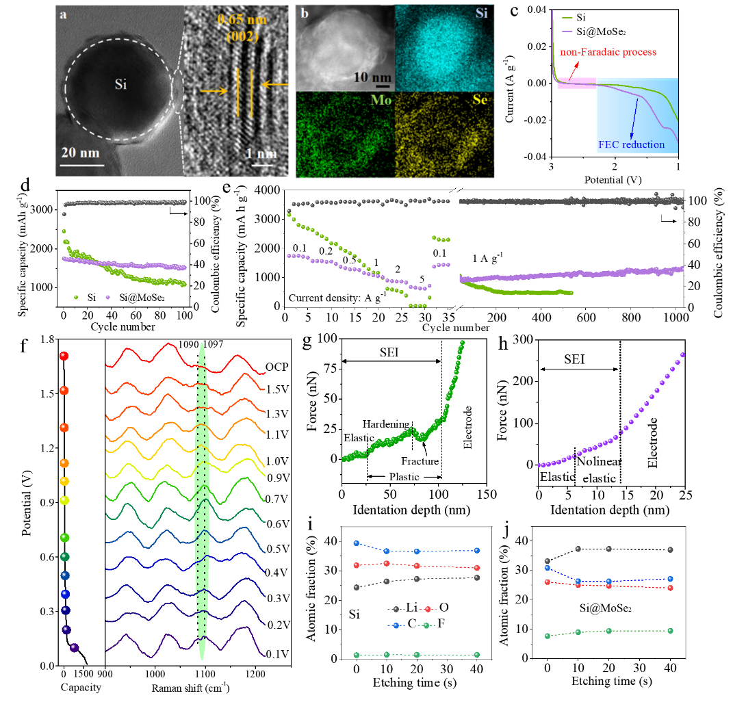 图1 (a,b)Si@MoSe2的表征;(c,d,e)Si@MoSe2与Si电极的电化学性能;(f)首次放电中Si@MoSe2电极表面SEI的形成过程;(g-j)Si@MoSe2与Si电极表面SEI的表征。