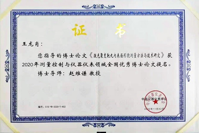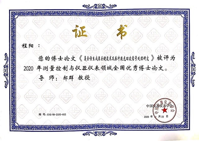12月24日,中国仪器仪表学会2020年科技奖励大会暨九届三次理事(扩大)会议在浙江省杭州市召开,本次大会上颁发了2020年全国仪器科学与技术学科优秀博士论文奖及提名奖。今年共评选出优秀博士论文5篇,优秀博士论文提名5篇。北京理工大学光电学院博士毕业生程阳获优秀博士论文奖,王龙肖获优秀博士论文提名奖。