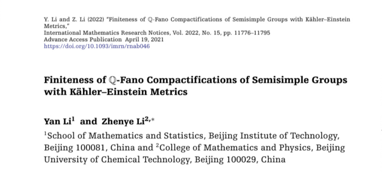 日前,北京理工大学数学与统计学院教师郦言与北京化工大学数理学院教师李振业在期刊《International Mathematics Research Notices》上合作发表题为《Finiteness of Q-Fano Compactifications of Semisimple Groups with Kähler–Einstein Metrics》的研究论文。该研究证明了对于连通、半单复Lie群G,具有Kähler-Einstein度量的Q-FanoG-紧化空间只有至多有限个。