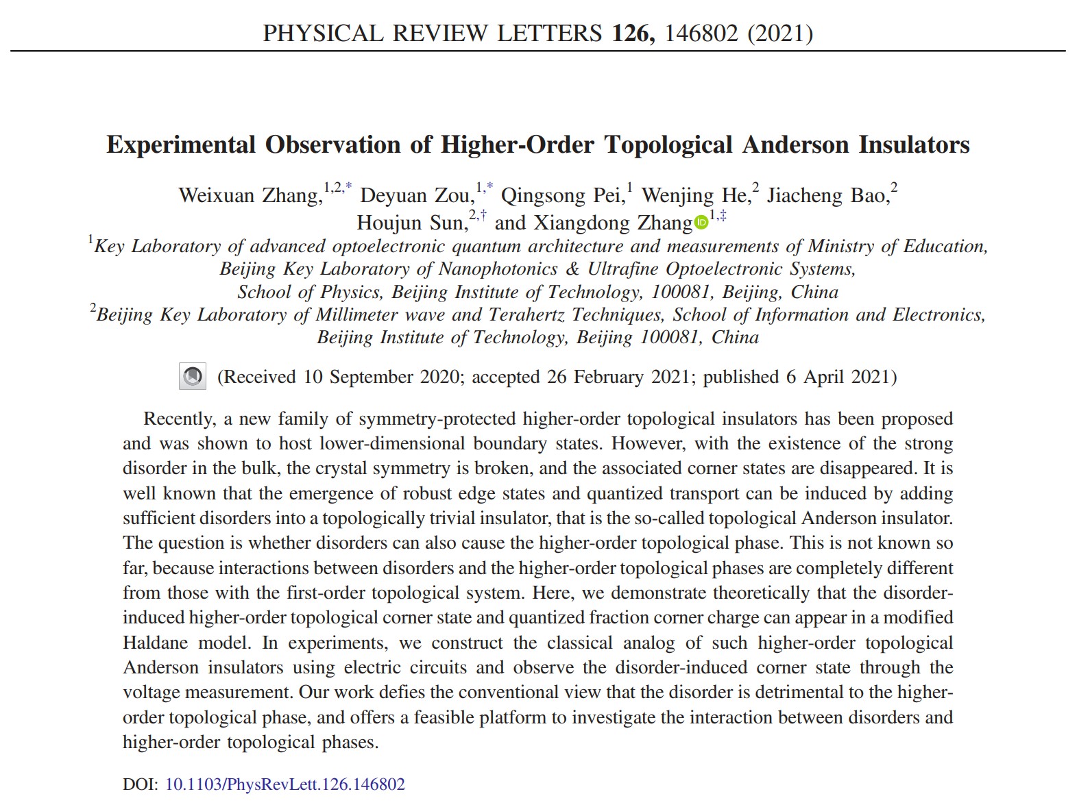 相关工作在Phys. Rev. Lett.上发表[Phys. Rev. Lett., 126 146802 (2021)]。北京理工大学物理学院2015级博士生张蔚暄(现为信息与电子学院特立博士后)和博士生邹德源为论文的共同第一作者。值得指出的是,近期两篇相关的理论工作[Phys. Rev. Lett. 125 166801 (2020); Phys. Rev. B 103 085408 (2021)]同样证明了无序引起的高阶拓扑相的存在。