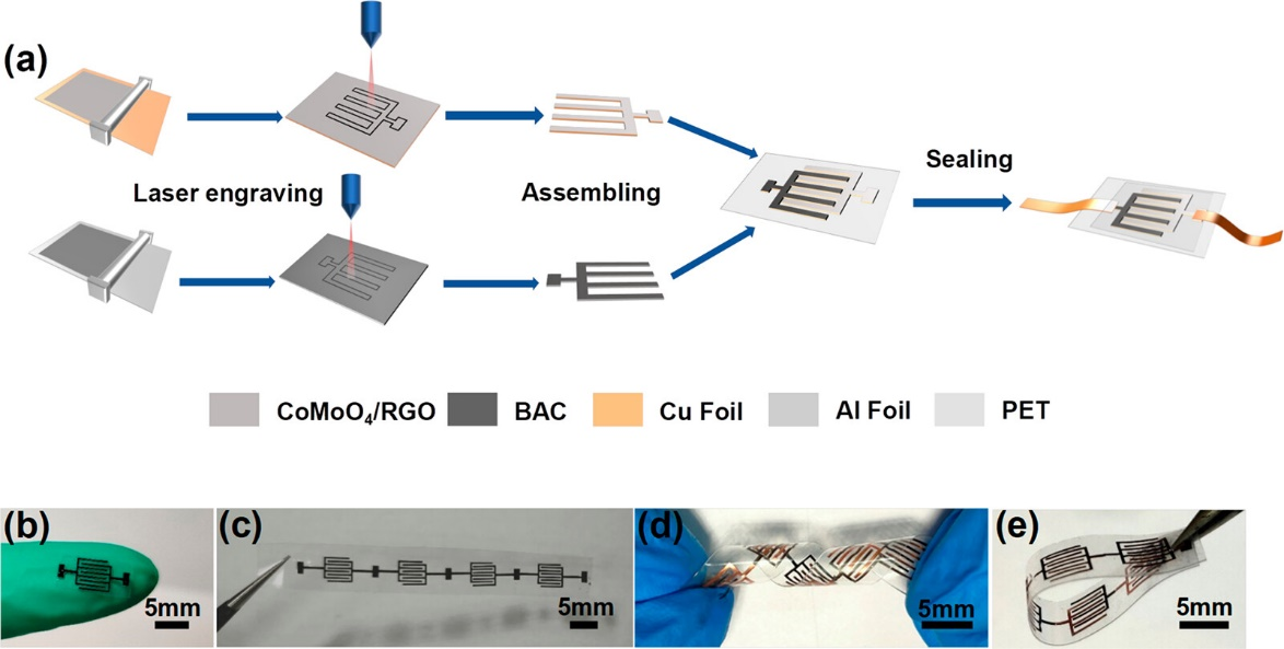 微器件的平面叉指电极的激光加工制造示意图如图1所示,通过激光加工技术可以很好的实现器件的图案化和微型化。所制备的单个储能器件面积仅为0.1251 cm2。同时激光切割和组装策略可以在PET柔性基底表面实现集成,在满足需要不同电压阈值的各种电子设备的需求方面具有巨大的潜力。得益于其良好的柔韧性,即使在扭转、弯曲状态下也能保持其完整性。
