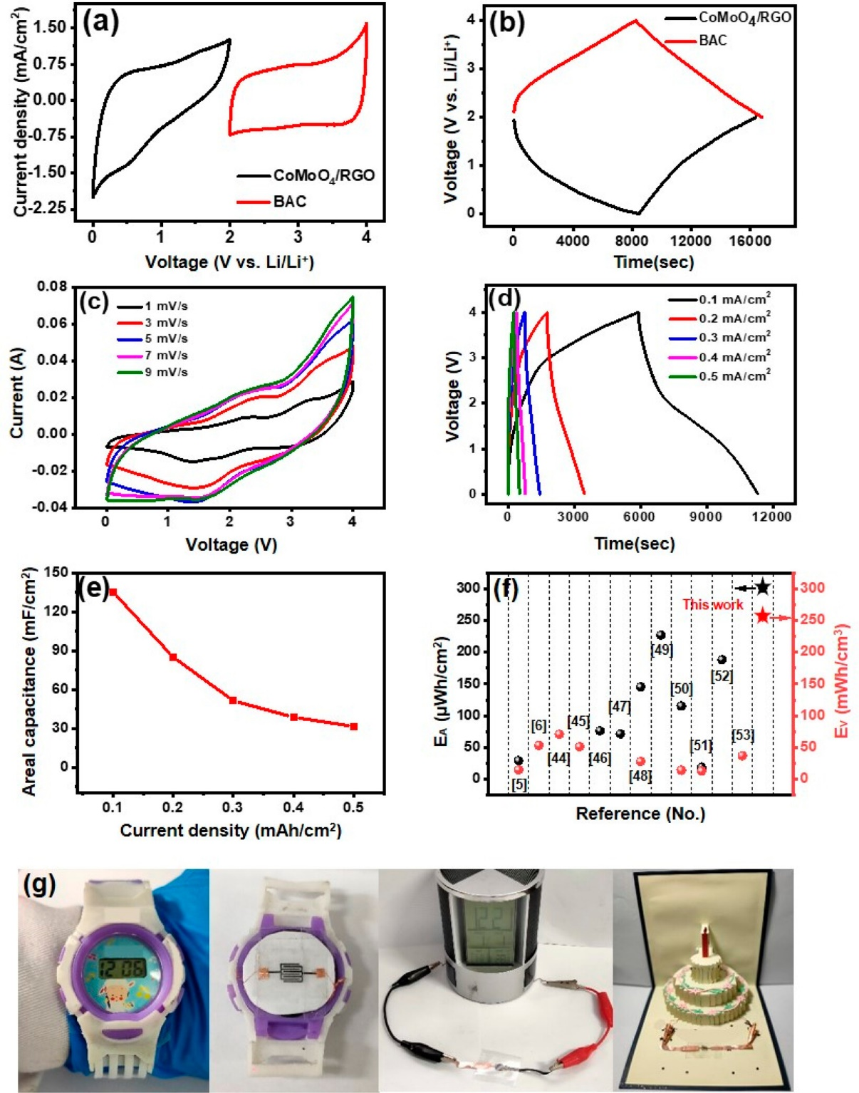 综上,本工作提出了一种制备具有高电压窗口的锂离子型微型电容器的有效策略。基于激光切割和组装,采用预锂化后具有快速反应动力学的CoMoO4/RGO作负极,具有高比表面积的BAC(3276 m2/g)作为正极,制备了具有4V高工作电压的新型LIMC。所制备的LIMC在0.1 mA/cm2的电流密度下具有135.4 mF/cm2(150.4 μAh/cm2)的高面电容,面积能量密度可达301 μWh/cm2,优于大多数微型金属离子混合电容器。该LIMC可以驱动手表、笔筒、电子贺卡等各种不同电压阈值的电子产品,证明了该器件的功能性和该策略的有效性。LIMC具有优异的可逆电容和高能量密度,有望成为新一代微机电系统的微能源装置。这项工作不仅拓宽了开发高性能微型电容器的新思路,还揭示了微型混合电容器作为高能量输出储能器件的潜力。