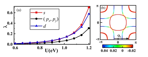 图1 (a):超导配对对称性为s-wave。 (b)s±-wave超导能隙函数在费米面上的分布