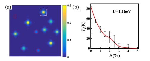 图2 (a)顶角氧缺陷附近形成的局域磁矩。 (b) 超导临界温度作为顶角氧缺陷浓度的函数。