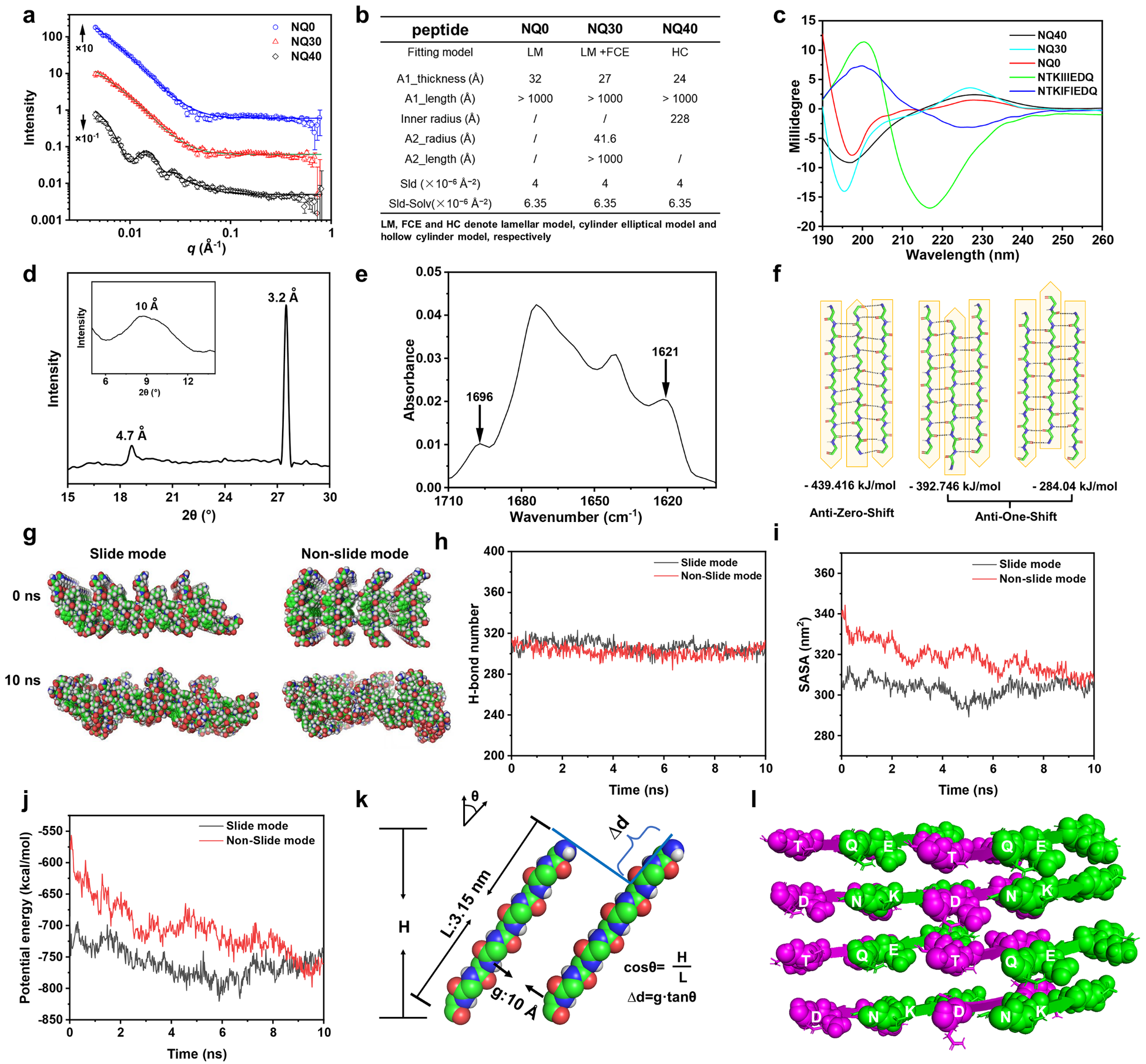 进一步的采用小角中子散射,圆二色光谱,XRD以及分子动力学模拟等手段对多肽自组装机理进行了解释。证明了多肽自组装过程中的排除体积效应导致组装体中β-折叠产生了不同程度的倾斜。这种特殊的分子排布行为能将具有靶标识别活性的残基侧链特异性的展示在组装体表面,从而高效建立组装体结构-性能之间的关系。