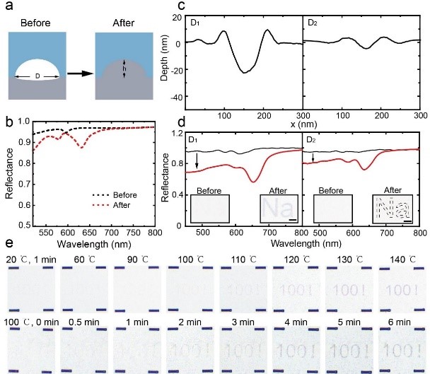 在本工作中,研究团队开发了一种热力学诱导的纳米结构形变来操控钠等离激元超表面的方法。利用快速冷却旋涂技术,构造了具有气态纳米间隙的纳米反穹顶结构的等离激元结构色。当钠再次被加热到液态时,在石英纳米孔附近发生了液态金属形变,从而改变反射光谱和颜色。理论分析表明,颜色变化主要源于混合等离激元共振模式的变化。最后,研究人员设计并演示了一种热敏“隐形墨水”装置。这些结果表明,钠基等离激元超表面在传感器、信息加密、光学数据存储、成像和显示器中具有巨大的应用潜力,为低损耗等离子体器件的动态控制提供了新的研究路径。