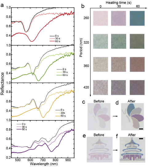 借助这一液态金属纳米形变诱发的光谱变化机制,研究人员构造了在可见波段响应的等离激元结构色超表面(图3)。可以看到,在对器件进行加热后,颜色发生了明显的变化。进一步的,研究人员通过控制石英纳米微孔的大小,开发了一种具有“隐形墨水”功能的钠超表面器件。如图4所示,当石英微孔足够小时,反穹顶结构的曲率能够大大增加,从而接近于平面,使得反射光谱接近于镜面反射,在器件中的钠受热熔化后,对微孔进行填充,使得图案显形。钠的熔点接近100℃,因此在温度报警、信息加密等方面具有重要的应用潜力。