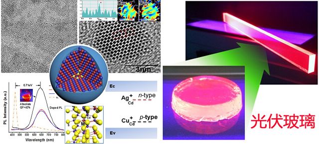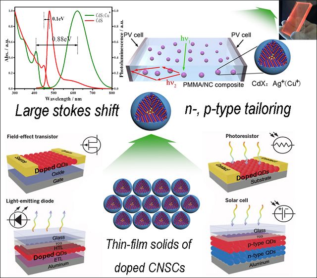 北京理工大学材料学院张加涛研究团队近三年,利用TBP、PPh3等膦配体引发的被掺杂离子的非晶半导体纳米颗粒与主体半导体阳离子之间的离子交换反应,调控其反应的热力学和动力学过程,实现被掺杂离子在半导体纳米晶(II-VI族等)中的深度位置的,异价取代性掺杂。实现了Ag+,Cu+离子在CdS,CdSe,以及CdSSe等半导体纳米结构(量子点,纳米片,2D薄膜)中的深度取代性掺杂及可控的掺杂浓度。一方面,实现了II-VI半导体量子点中稳定、高效的掺杂发光(绝对量子产率可达50%以上,稳定1年以上),有效避免了“自清洁”引起的掺杂发光不稳定性;另一方面,利用Ag+,Cu+的异质取代性掺杂,实现了p型,n型II-VI族量子点的制备及掺杂能级调控。此种掺杂发光有较大的Stokes位移(0.7 eV 以上)。利用原位甲基丙烯酸甲酯(MMA)配体交换,实现了这些掺杂纳米晶在有机玻璃里的厘米级宏观尺寸的均匀分散,进一步增大了Stokes位移(0.85 eV 以上),实现了优良的荧光聚集(Luminescence Solar Concentrator, LSC)性能。这些研究成果陆续发表在顶级SCI期刊《德国应用化学》(Angew. Chem. Int. Ed. 2015, 54,3683-3687)、《先进材料》 (Adv. Mater. 2015, 27,2753-2761)、《NPG亚洲材料》(NPG Asian Mater. (2015) 7, e152; doi:10.1038/am.2014.120)以及美国《物理化学C》杂志上(J. Phys. Chem. C 2017, 121, 6152−6159)上。