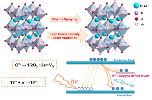 图1 La1-xSrxTiO3+δ涂层晶格结构中氧空位/Ti3+产生机制及其能带结构变化示意图