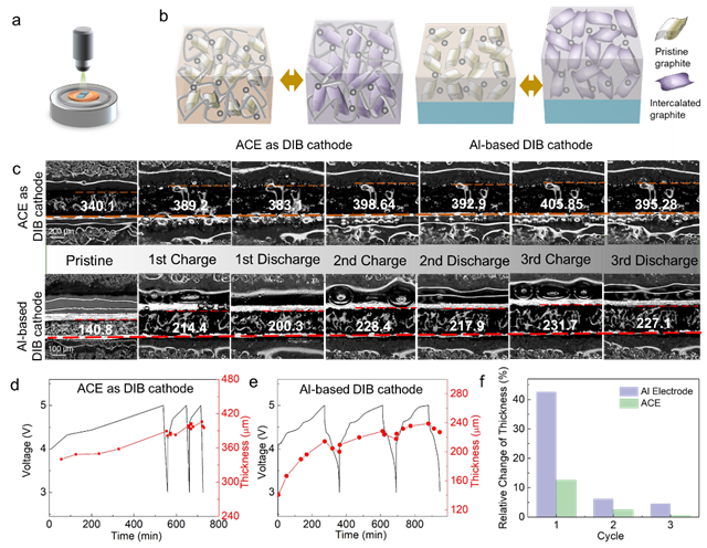 图1 双离子电池原位光学可视化平台验证:(a)原位装置示意图,(b,c)全碳双离子电池正极与传统铝集流体涂覆石墨正极的脱嵌阴离子体积变化图,(d,e)截面厚度变化,(f)两种正极对应的体积变化率比较。