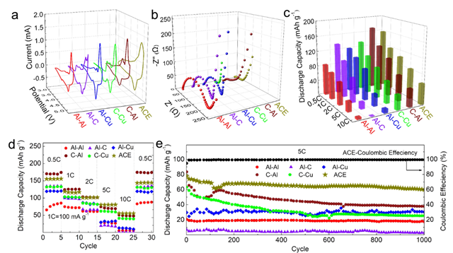 图2 六种不同双离子电池电化学性能:(a)CV,(b)EIS,(c)放电比容量,(d)倍率,(e)5C下长循环(1C="100" mA g-1)。ACE代表正负极均采用三维炭网络集流体涂覆石墨构造全碳电极与全碳双离子电池。