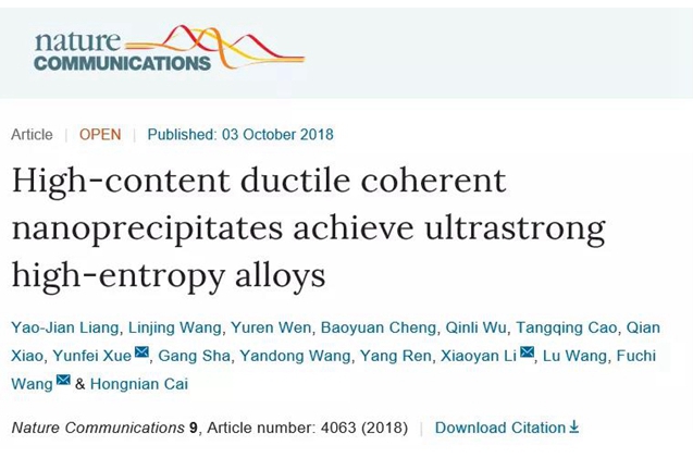日前,北京理工大学材料学院王富耻、王鲁教授团队,薛云飞课题组在国际顶级学术期刊《Nature Communications》上发表了题为《High-content ductile coherent nanoprecipitates achieve ultrastrong high-entropy alloys》的研究论文。该研究创新了高熵合金设计理念,利用不同强化机理,开发出了超强高熵合金。