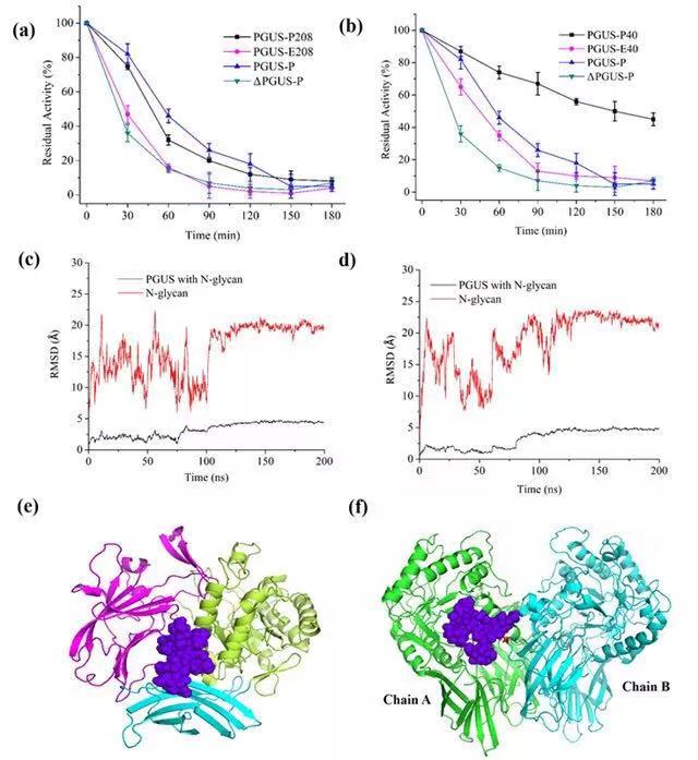 北京理工大学化学与化工学院李春教授课题组以前期完成晶体结构解析的真菌β-葡萄糖醛酸酶(PGUS,同源四聚体结构)为模型蛋白,并将其在毕赤酵母(能够在蛋白质的特定位点引入高甘露糖型糖链)中异源表达(PGUS-P),验证了蛋白质内源的Asn383和Asn594位点的糖基化对PGUS-P的稳定性有显著影响。通过计算机模拟与实验相结合的方法,揭示了PGUS-P的两个內源N-糖基功能类似于“连接臂”,能将空间上距离相近的超二级结构域相连,使得其局部结构更加紧凑,从而提高了蛋白质的整体稳定性。以此为启发,研究人员通过对PGUS的晶体结构分析,在超二级结构域、结构域、亚基界面间设计了N-糖基化位点,进一步提高了PGUS-P的动力学、热力学稳定性。酶学性质表征并结合全原子分子动力学模拟结果表明,在结构域界面间的Asn208位糖链和周围二个结构域产生的作用力,形成了“糖桥”构型,将蛋白质在70°C下的半衰期提高了2.7倍,去折叠自由能提高了8.4kJ/mol;而在亚基界面间的Asn40位糖链通过和相邻亚基的作用,形成了“糖卡”构型,将热稳定性提高了7.1倍,去折叠自由能提高了14.6kJ/mol,同时酶的催化效率也提高了1.7倍。