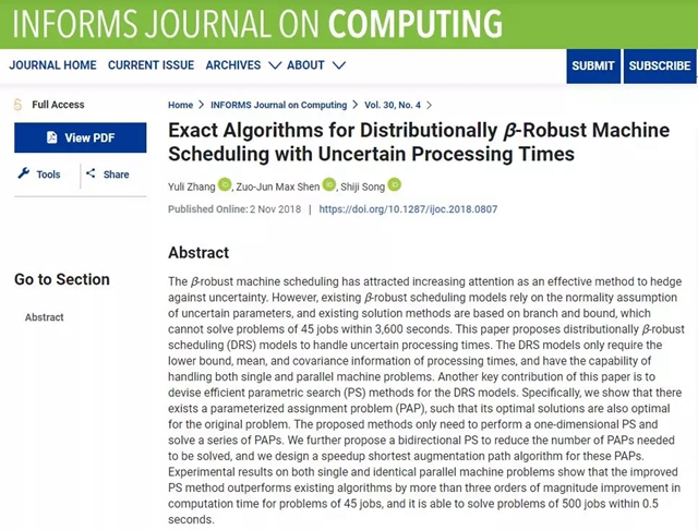 北理工管理与经济学院教师张玉利与美国加州大学伯克利分校申作军教授、清华大学宋士吉教授合作的研究成果“Exact Algorithms for Distributionally β-Robust Machine Scheduling with Uncertain Processing Times”在运筹与管理领域顶级期刊《INFORMS Journal on Computing》发表。张玉利特别研究员为本文第一作者。该刊为美国运筹学和管理学研究协会(INFORMS)季刊,是国际商学院研究能力评估参考的24本顶级期刊(UT-Dallas 24期刊)之一。
