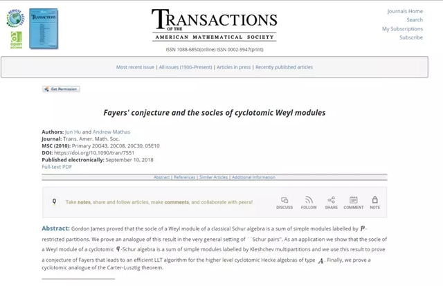 北京理工大学数学与统计学院胡峻教授在国际顶级学术期刊《Transactions of the American Mathematical Society》上发表了题为“Fayers’conjecture and the socle of cyclotomic Weyl modules”的研究论文。该论文研究了分圆Schur代数的分圆Weyl模的基座,证明了这些基座中的单模全部都是由Kleshchev多重剖分来参数化,并在此基础上证明了英国代数学家Fayers提出的关于Fock空间典范基的一个猜想。