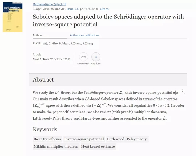 日前,北京理工大学数学与统计学院张军勇特别研究员与及其合作者在国际数学顶级学术期刊《Mathematische Zeitschrift》上发表了题为“Sobolev spaces adapted to the Schrödinger operator with inverse-square potential”的研究论文。该论文通过建立含反平方位势薛定谔算子所对应的Littlewood-Paley 理论、乘子定理、Hardy 不等式等调和分析工具,证明了含反平方位势薛定谔算子在L^p框架下的Sobolev空间与经典的Sobolev空间的等价性。