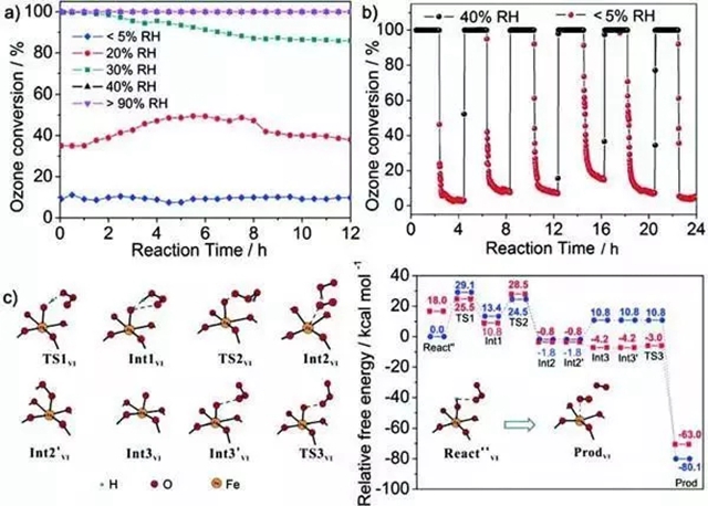 MIL-100(Fe)不同高湿度环境下对臭氧的转化率(a)分别在<5%RH、20%RH、30%RH、40%RH和> 90%RH下MIL-100(Fe)的臭氧转化率。b)在交替相对湿度下MIL-100(Fe)上的臭氧转化率。c)优化了在MIL‐100(Fe)催化臭氧分解过程中沿路径稳定点的结构和相应的势能曲线。d)蓝色和红线分别表示六重态和四重态MIL-100(Fe)氢氧化物复合物的能级。实验条件:用0.27g石英砂稀释0.03g催化剂,C(O₃)= 45ppm,流速="1000mL·min^-1,RH="45%,室温。)
