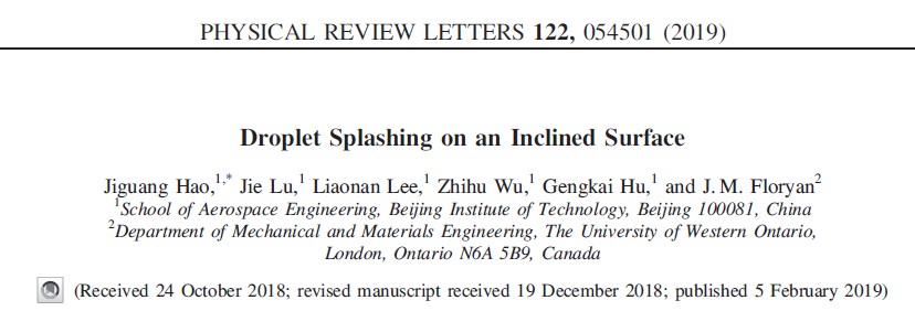 2019年2月5日,北京理工大学宇航学院郝继光讲师、胡更开教授和加拿大西安大略大学Floryan教授合作在物理学顶级的学术期刊《Physical Review Letters》(IF = 8.839)上发表了题为《Droplet splashing on an inclined surface》的研究论文。郝继光为该论文第一和通讯作者,宇航学院2018级硕士研究生鲁杰、2015级本科生李辽南及2017级硕士研究生吴志鹄分别为第二、第三和第四作者,北京理工大学为论文的第一单位和唯一通讯单位,该工作得到了国家自然科学基金和“111”引智计划的支持。