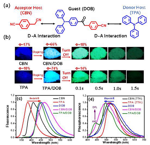 具有有机室温磷光性能的材料由于具有荧光材料所不具备的延时发光特性,所以在防伪、生物成像、光电器件等领域具有很强的应用前景。且有机磷光材料相比无机贵金属磷光材料又具有成本低、可塑性强、低毒性等优势,所以引起了研究者的广泛注意。传统的有机磷光材料带有咔唑,羰基或者氯等卤族重原子等。最近日本的Adachi教授等报道了主客体掺杂导致的室温磷光材料,但是此类材料的主体和客体必须一个是给体一个是受体。为了拓展主体或者客体的使用性,董宇平课题组首先设计合成了以三苯胺和苯乙腈为单元的具有D-A结构的客体化合物DOB,该客体具有微弱的短寿命磷光,并选择DOB的前体化合物即具有给体性质的三苯胺(TPA)和具有受体性质的对氰基苯乙腈(CBN)分别作为主体。DOB中的三苯胺单元会和主体CBN发生给受体之间的相互作用,同样DOB中的苯乙腈单元也会和主体TPA发生给受体相互作用。且由于DOB含有三苯胺和苯乙腈部分,会使得DOB容易进入到主体的晶格当中。作者按照客体和主体摩尔比为0.0005:1的比例通过重结晶的方法得到了掺杂材料CBN/DOB和TPA/DOB。相比原本的主体仅具有微弱的荧光,掺杂后的材料具有非常强的荧光(Ф=63%-76%)以及长寿命室温磷光(Ф=7.6%-14.5%, τ="119" ms-317 ms)。作者认为主客体之间的相互作用使得掺杂材料产生新的能级,从而导致掺杂材料具有明显的室温磷光性能。