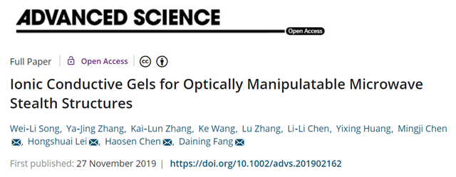 继2018 年11月17日方岱宁院士研究团队在著名材料学期刊 《先进功能材料》(Advanced Functional Materials, 2018, 1806383.)报道化学电源系统反向设计的电化学-力学-光学耦合仿生变色器件之后,11月27日,国际顶级综合性期刊《尖端科学》 Advanced Science, 2019, 1902162(期刊IF="15.804)在线报道了该研究团队最新的化学电源系统反向设计成果:首次基于透明化学电源电解质(第二类导体)设计多层光学可调电磁隐身结构(Ionic" Conductive Gels for Optically Manipulatable Microwave Stealth Structures)。