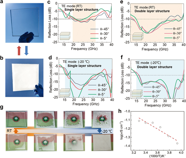 图3 不同透光状态下的多层隐身结构进行性能实测:(a)室温下光学透明多层隐身结构;(b) -20摄氏度下光学不透明多层隐身结构;(c)使用单层凝胶的多层隐身结构的常温透明状态下实测电磁隐身性能;(d) 使用单层凝胶的多层隐身结构的-20摄氏度下非透光状态下实测电磁隐身性能;(e) 使用双层凝胶的多层隐身结构的常温透明状态下实测电磁隐身性能;(f) 使用双层凝胶的多层隐身结构的-20摄氏度下非透光状态下实测电磁隐身性能;(g)温度调控的透光实验验证;(h) −20~30 °C下凝胶的离子电导率。