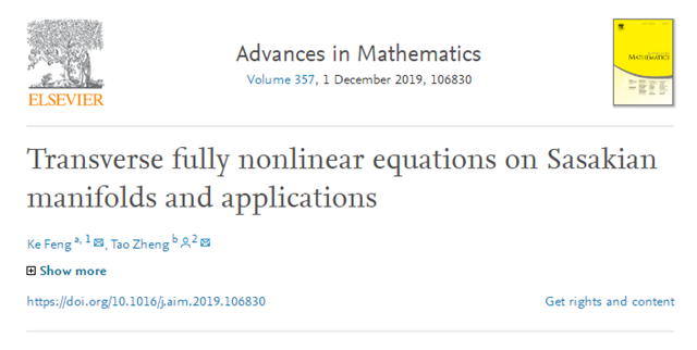 日前,北京理工大学数学与统计学院郑涛副研究员在数学顶级学术期刊《Advances in Mathematics》在线发表题为“Transverse fully nonlinear equations on Sasakian manifolds and applications”的研究论文。该论文研究了Sasaki流形上一类完全非线性方程的可解性,作为几何应用,证明了Sasaki流形上横截(强)Gauduchon度量和横截平衡度量的Calabi-Yau型定理。论文同时指出,这类完全非线性方程在复余维为n的紧致无边具有横截Hermite度量的紧叶层流形上也是可解的,作为几何应用,论文给出了横截Hermite度量和横截(强) Gauduchon度量的Calabi-Yau型定理。