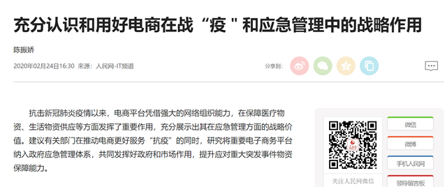 一场恰逢春节的新冠肺炎疫情爆发,对我国经济社会生活带来了全方位的影响,在全国人流物流受限、企业复工受阻等情况下,以京东、阿里等为代表的电商凭借网络平台优势,有力保障了物资供应、促进社会稳定,有效缓解了疫情的硬冲击。在应对疫情的应急物资保障战役中,电子商务彰显出了特别的战略价值。