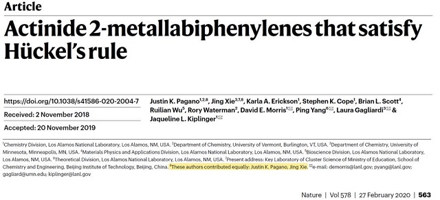 近日,北京理工大学化学与化工学院引进的特立青年学者谢静教授在《Nature》杂志上合作发表题为“Actinide 2-metallabiphenylenes that satisfy Hückel’s Rule”(符合“休克尔定律”的锕系金属取代亚联苯化合物)的文章(Nature 2020, 578, 563-597), 锕系金属让芳香性和反芳香性环共存。谢静教授为该论文的共同第一作者,负责完成论文的理论计算部分,此研究是与美国洛斯阿洛莫斯国家实验室Jaqueline L. Kiplinger课题组以及美国明尼苏达大学Laura Gagliardi教授合作完成。