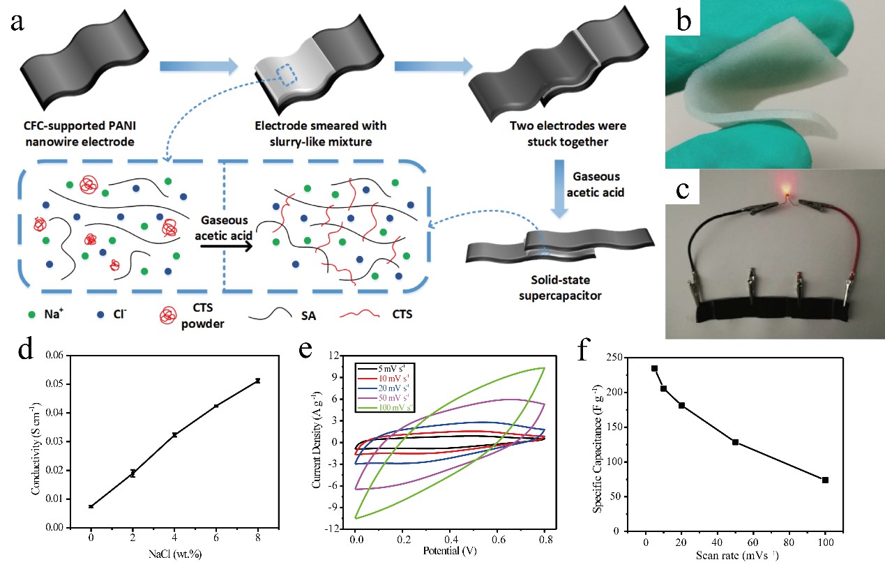 赵健等基于SD-A-SGT法构建了壳聚糖/海藻酸钠(CTS/SA)复合聚电解质复合物理水凝胶,其可在8%的NaCl电解质加入情况下保持0.29MPa的拉伸强度,保障了水凝胶在良好力学强度前提下优异的电子传输效应。将上述水凝胶与聚苯胺电极组装成超级电容器(图2)。电解质具有极高的离子电导率(0.051 S·cm-1)和优异的力学性能,拉伸强度达0.29 MPa,断裂伸长率为达109.5%。用聚电解质和常规聚苯胺(PANI)纳米线电极制备的固态超级电容器在5 mV·s-1下具有234.6 F·g-1的高比电容,1000次循环后具有95.3%的电容保持率和良好的循环稳定性,为制备可生物降解的全天然高分子超级电容器开辟了一条新的途径。上述成果发表于 J. Power Sources (2018, 378, 603-609)。