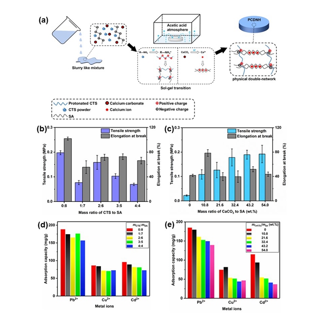 图3. CTS/SA/Ca2+ PCDNH的制备及性能测试。(a)CTS/SA/Ca2+ PCDNH的制备示意图及形成机理;(b)(c)CTS/SA/Ca2+ PCDNH的拉伸强度和断裂伸长率;(d)(e)CTS/SA/Ca2+ PCDNH对三种重金属离子的吸附量。