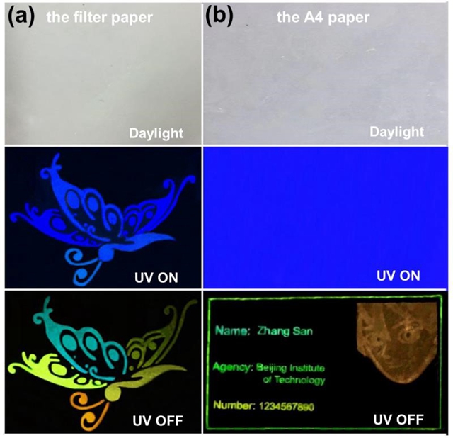 此外,作者又探索了掺杂材料在防伪打印方面的应用。作者首先的把主体化合物附着在商业性A4纸以及不具有荧光发射的普通纸上,再把客体分子溶解在实验室常用溶剂如二氯甲烷中以用作油墨。在纸张上可以进行手写绘画或者进行喷墨打印,由于商业性A4纸具有很强的荧光背景,因此在日光灯和紫外光照射下均不能得到相应的信息,只有在去除紫外光照射后的几秒内呈现动态的颜色变化。所以该油墨打印出的证件具有极大的防窃取性。