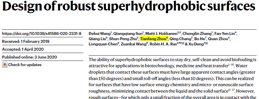 6月3日,《Nature》正式刊发了北京理工大学周天丰教授与电子科技大学邓旭教授团队和芬兰阿尔托大学Robin H. A. Ras教授的研究成果“Design of robust superhydrophobic surfaces”,并被选为当期封面。该论文提出去耦合机制将表面浸润性和机械稳定性拆分至两种不同的结构尺度,通过在两个结构尺度上分别进行最优设计,为超疏水表面创造出具有优良机械稳定性的微结构“铠甲”,解决了超疏水表面机械稳定性不足的关键问题。