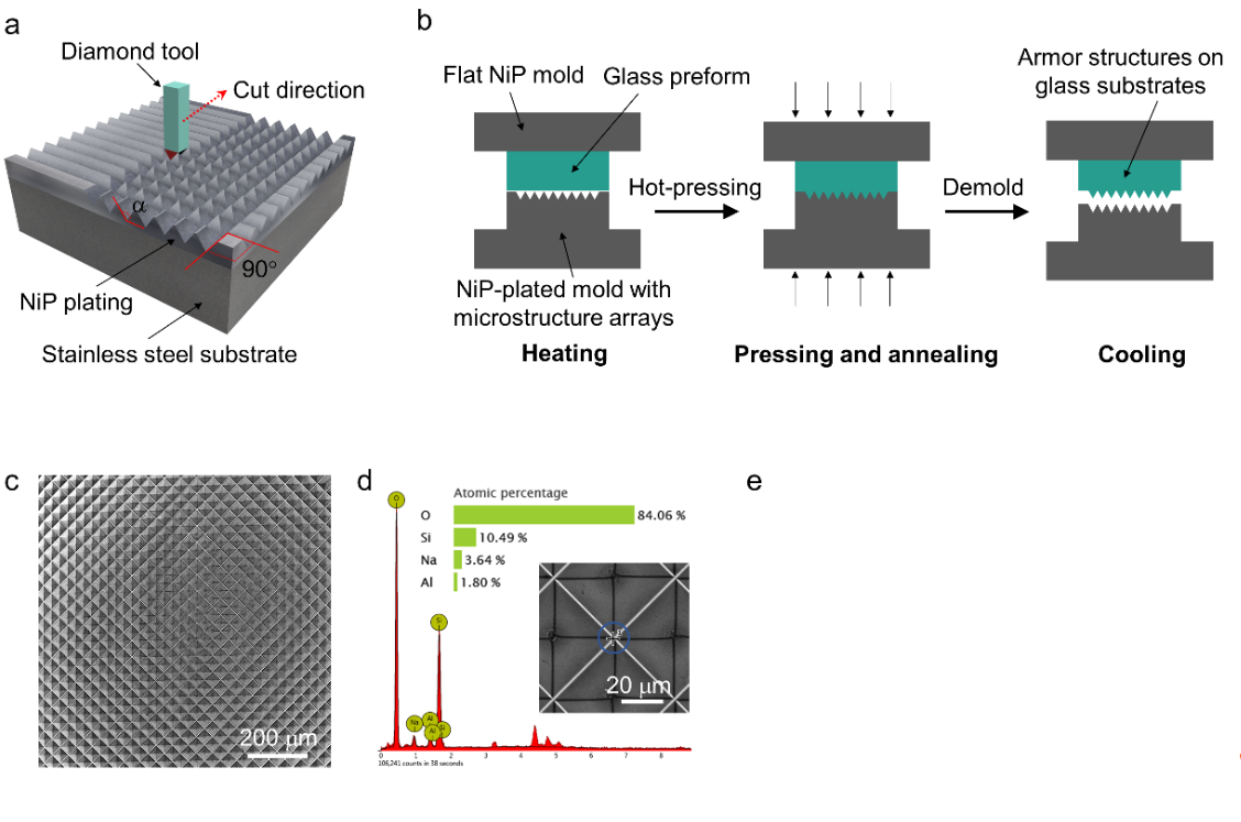 该论文基于全新思路,首次通过去耦合机制将超疏水性和机械稳定性拆分至两种不同的结构尺度,并提出微结构“铠甲”保护超疏水纳米材料免遭摩擦磨损的概念。玻璃铠甲化表面在集成高强度机械稳定性、耐化学腐蚀和热降解、抗高速射流冲击和抗冷凝失效等综合性能的同时,还实现了玻璃铠甲化表面的高透光率,为该表面应用于自清洁车用玻璃、太阳能电池盖板、建筑玻璃幕墙创造了必要条件。北京理工大学发挥其在玻璃微纳结构制造方面的优势,利用玻璃模压成形法实现了倒金字塔阵列微结构的玻璃铠甲制造。该论文创新的设计思路和通用的制造策略展示了铠甲化超疏表面非凡的应用潜力,必将进一步推动超疏水表面进入广泛的实际应用。