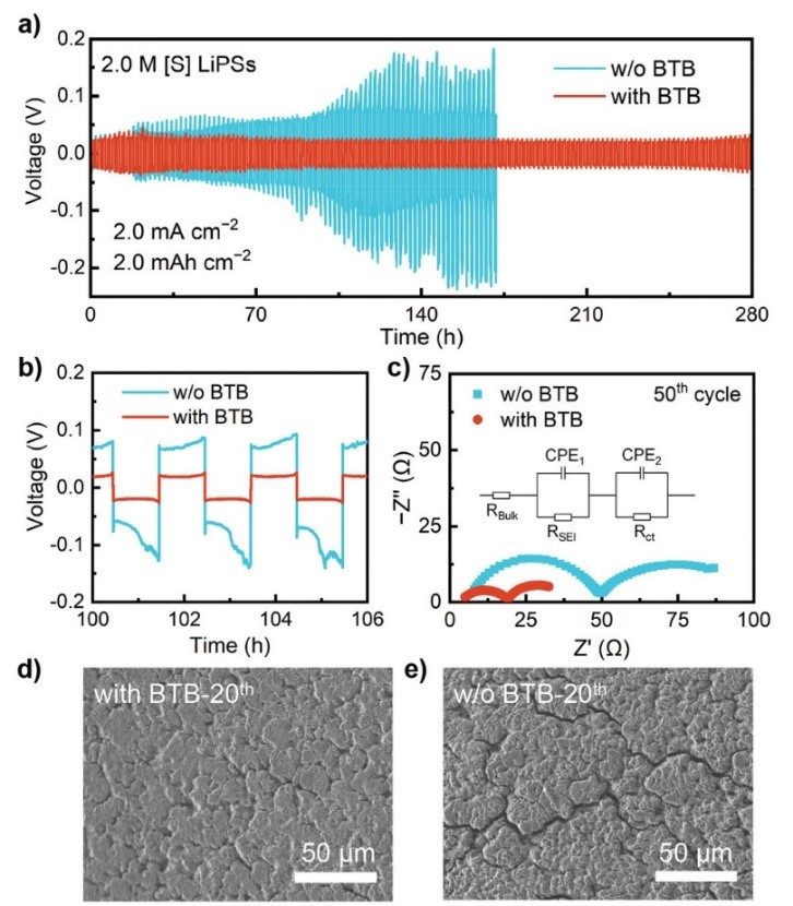 本工作通过引入3,5-双三氟甲基苯硫酚(BTB)作为电解液添加剂,设计了一种可以“屏蔽”多硫化物的含有机硫的固态电解质界面(SEI),以保护金属锂负极,在实用化条件下提升了锂硫电池的稳定性和循环寿命。