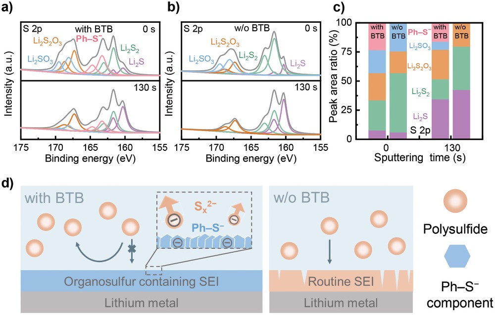 根据可视化实验和XPS,验证了BTB参与调控的含有机硫的SEI可以有效抑制多硫化物与金属锂的副作用,并且其组分可以稳定存在于SEI。