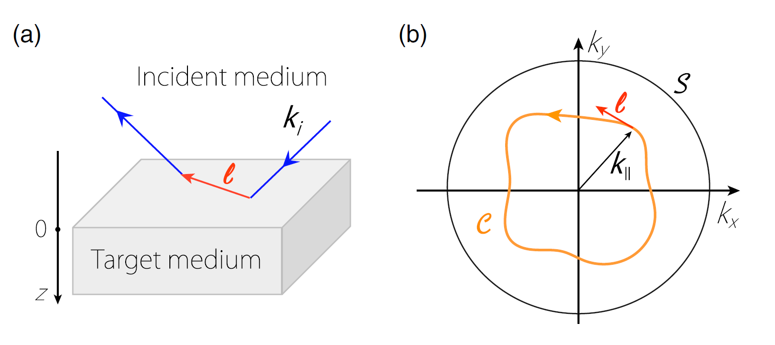 图1:(a)界面反射中反常位移的示意图。蓝色线段表示入射和反射的电子流,红色线段代表反常位移。(b)反常位移是随界面动量变化的一个矢量。C代表反常位移在界面动量空间中的环路积分。