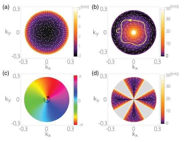 图2:(a)普通金属和外尔半金属所构成的模型示意图。(b)反常位移在界面动量空间的矢量场。箭头代表矢量的方向,颜色代表矢量的绝对值。(c)反射振幅的相位随界面动量的变化。