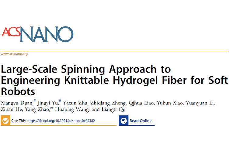 近日,北京理工大学化学与化工学院赵扬特别研究员与合作者在水凝胶纺丝与软体机器人方向取得重要进展。研究成果以“Large-Scale Spinning Approach to Engineering Knittable Hydrogel Fiber for Soft Robots”为题,于10月19日在线发表于ACS Nano,论文链接为https://pubs.acs.org/doi/10.1021/acsnano.0c04382。北京理工大学化学与化工学院本科生段翔宇与于静怡为共同第一作者,北京理工大学化学与化工学院赵扬特别研究员为通讯作者。北京理工大学为第一通讯单位。